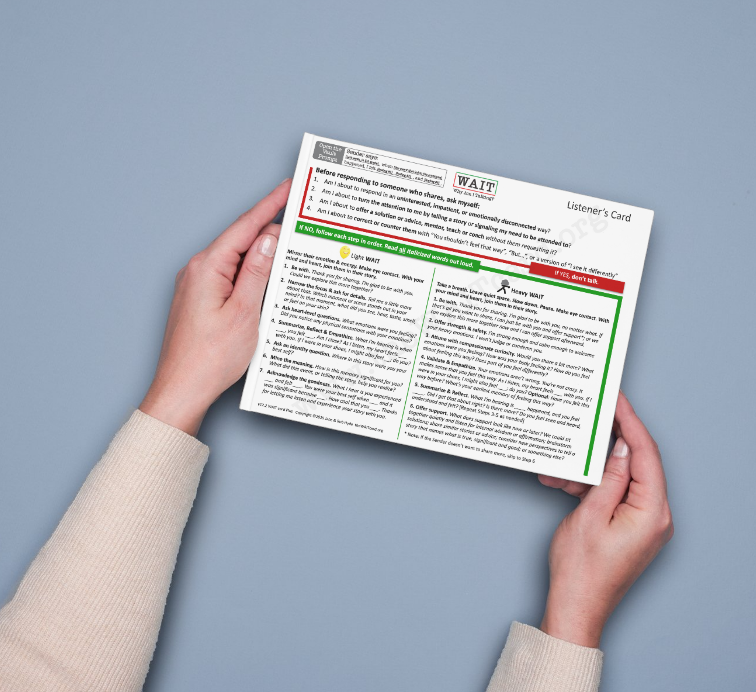 Do you love the WAIT card or other WAIT tools and the impact they've made in your life? Help us spread the word so others can discover the power of these tools. Whether it’s a social media post, a conversation, or a testimonial, your voice makes a difference. Click below to share and join us in making a greater impact together!
